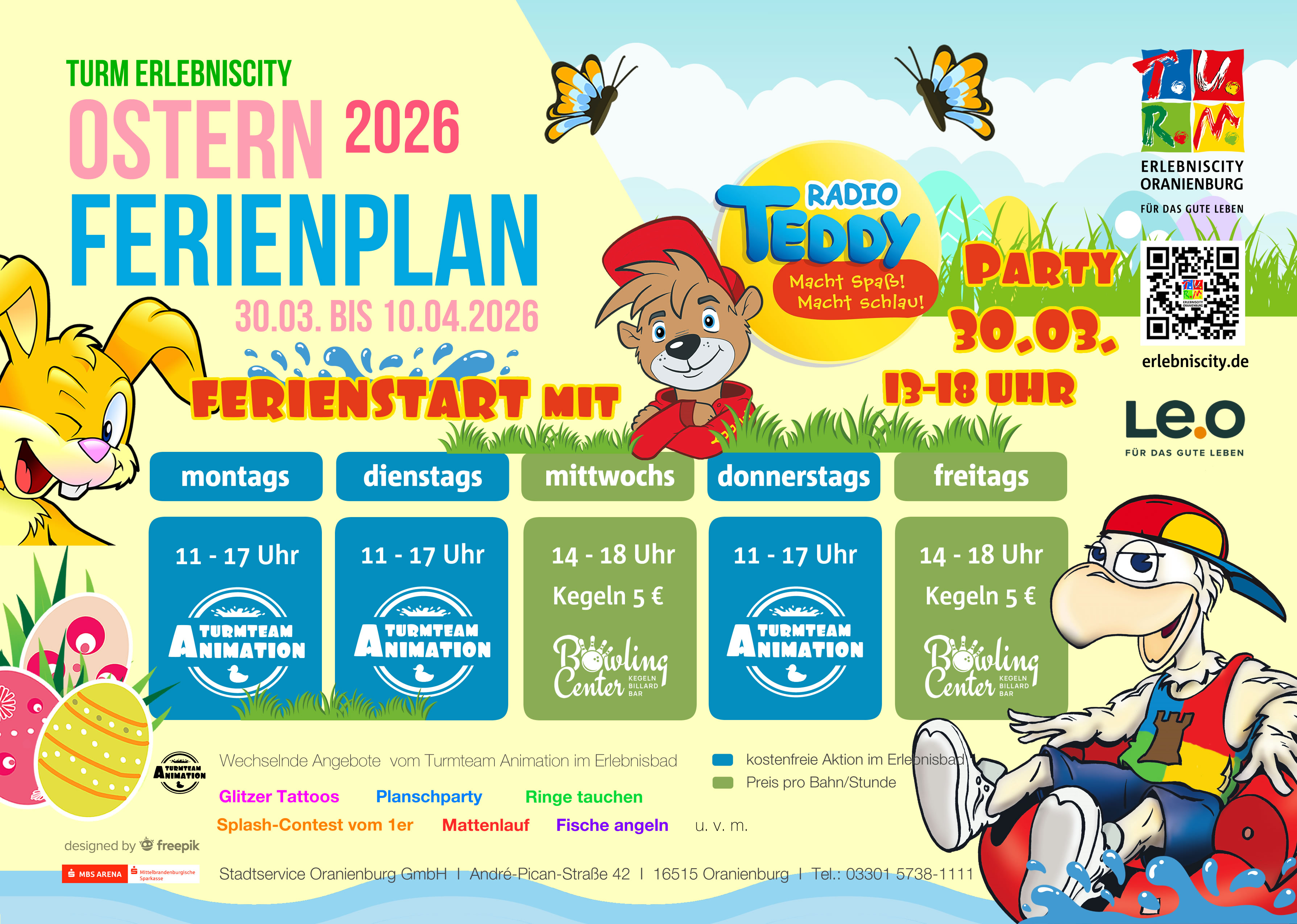Vom 30. März bis 10. April dürft ihr euch auf nassen Ferienspaß freuen. Wir starten mit der großen Radio-Teddy-Party gleich am Montag (30.03.2026, 13.00 -18.00 Uhr).