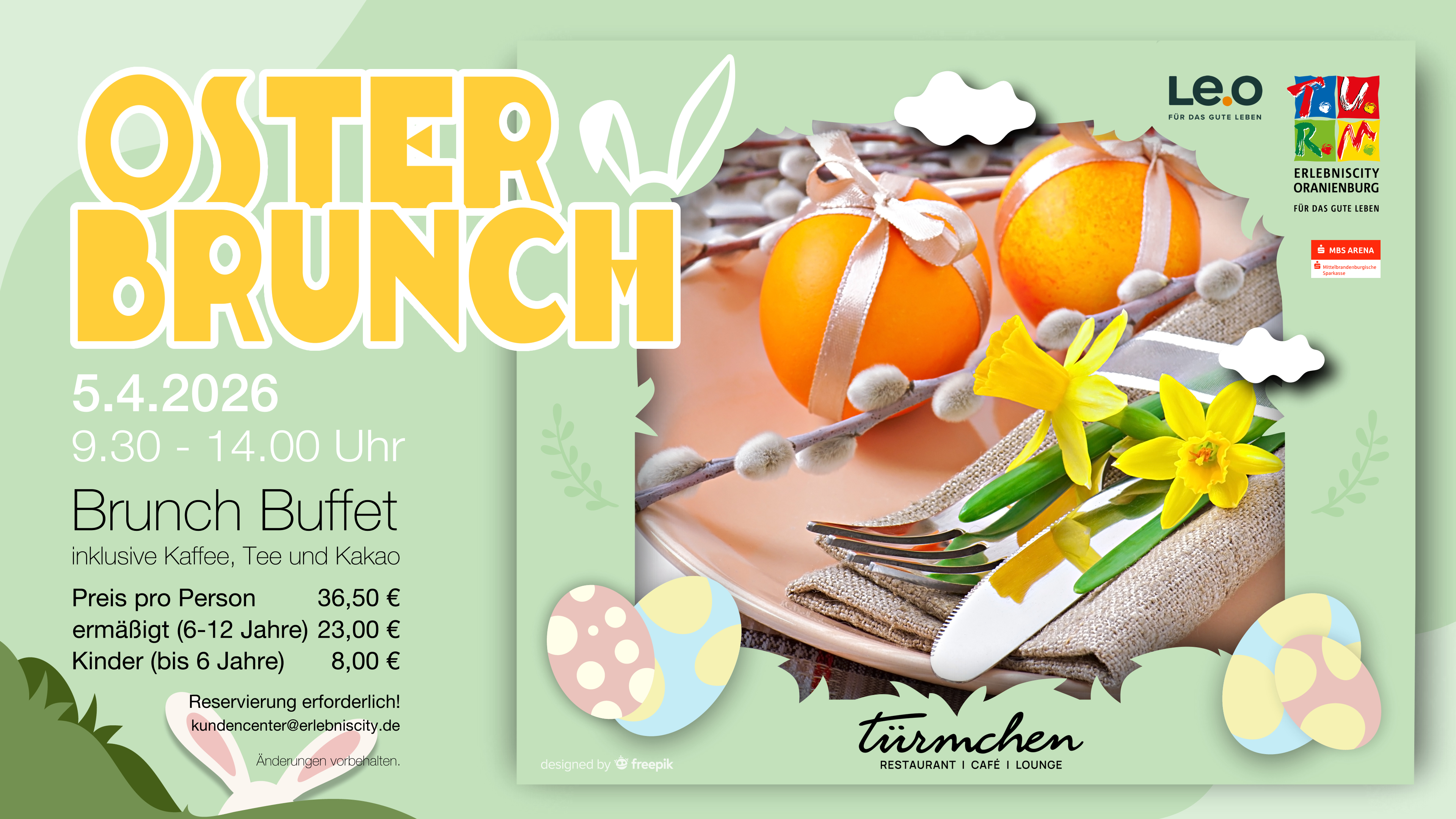 Euch erwartet ein abwechslungsreiches Oster-Brunch-Buffet, inklusive Kaffee, Tee und Kakao.
