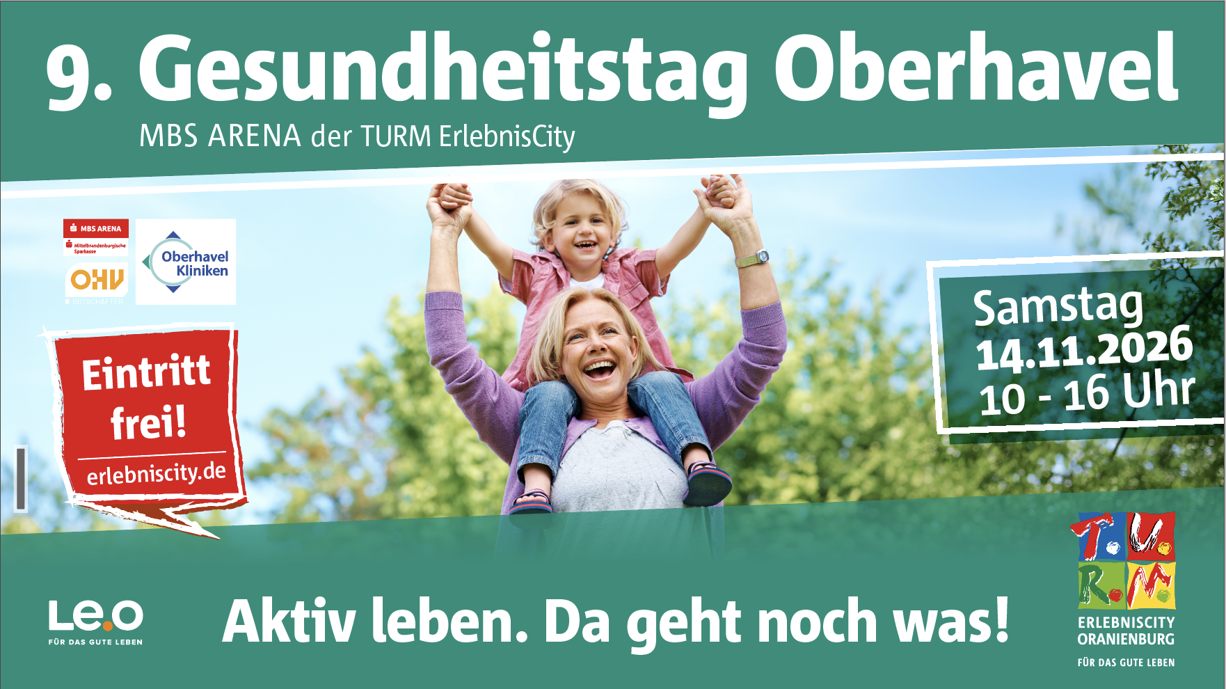 Der 9. Gesundheitstag Oberhavel findet in der MBS ARENA der TURM ErlebnisCity statt. Fachvorträge und zahlreiche Aussteller stehen für all die Fragen rund um das Thema Gesundheit, Vorsorge, Wellness, Vitalität sowie Fitness, Pflege und Medizin zur Verfügung.